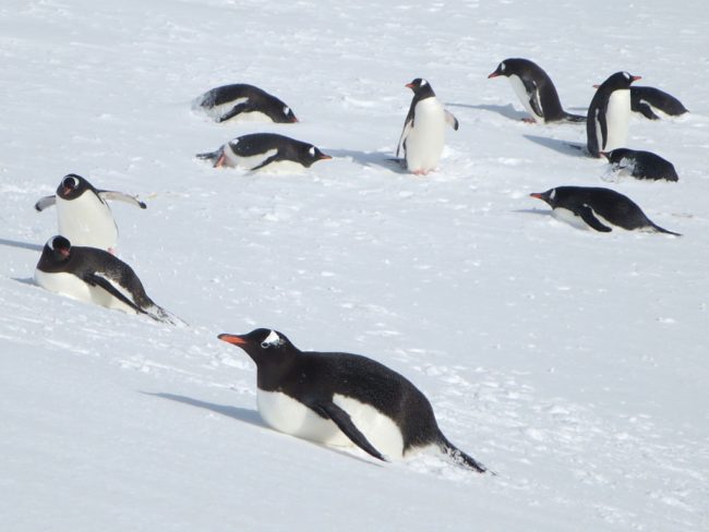 Penguins in frigid conditions usually glide on the icy surface to move faster, similar to people tobogganing in the ice during winters. Penguins slide with their bellies by propelling themselves forward with their flippers and feet in the snow to reduce energy consumption.