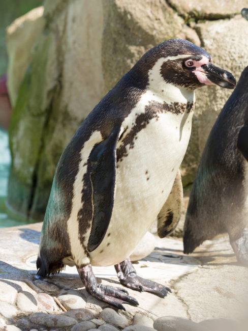 The Humboldt and Magellanic penguins are temperate species. Since they live in moderate conditions they have less of feathers and we can find fleshy areas on their face without the presence of plumage. They also have black stripe and dots on their body.